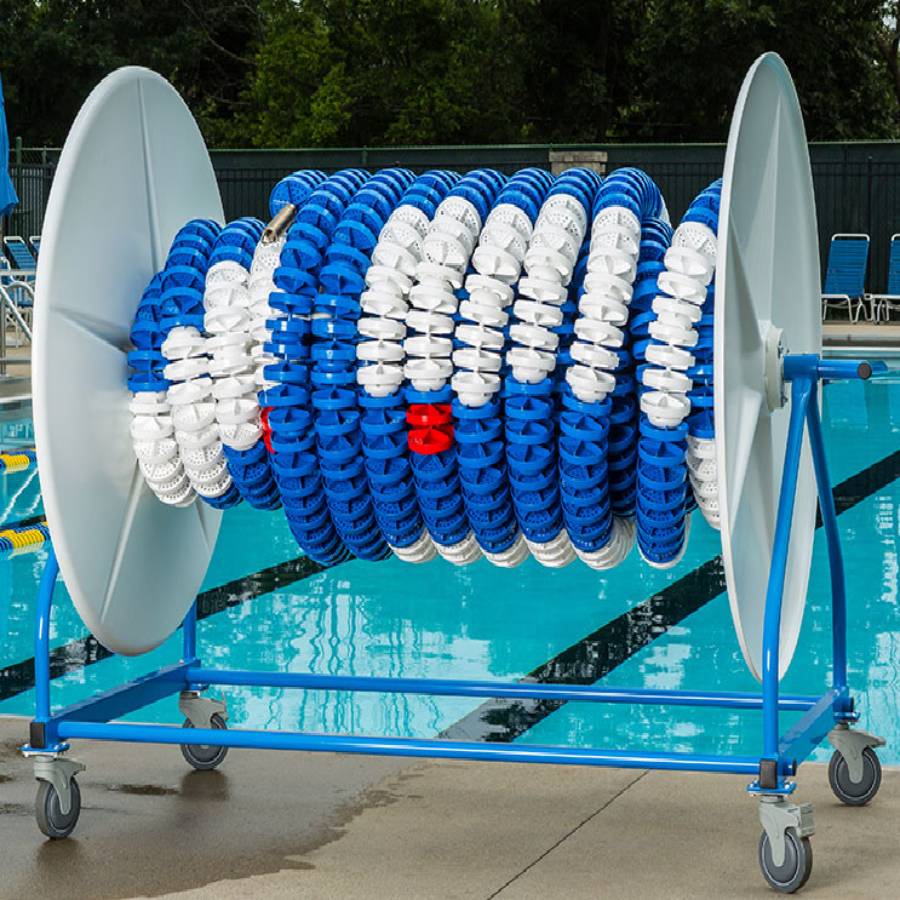 Our Stor-Lane Reel™ is designed for easy storage of Competitor® racing lanes. Rugged crank-and-wind construction stores over 500 feet of competitor racing lanes, and over 300 feet of gold medal racing lanes. The framework is electroplated aluminum, which supports the thermo-formed plastic reel assembly.