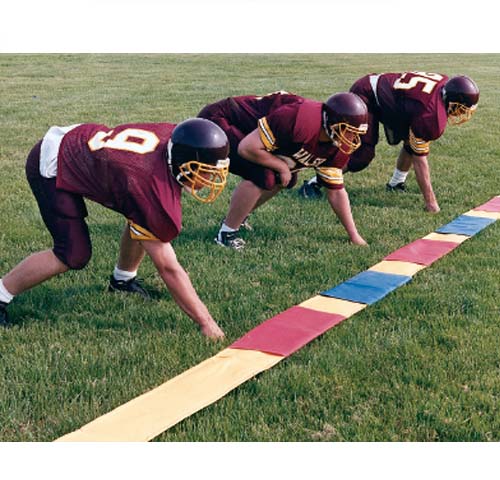 Football Alignment Spacer strip, 36' long x 10" wide with 8 moveable sleeves. Weighted at both ends. Ideal for football practice drills for use in positioning linemen. Available in yellow vinyl with red and blue vinyl sleeves.