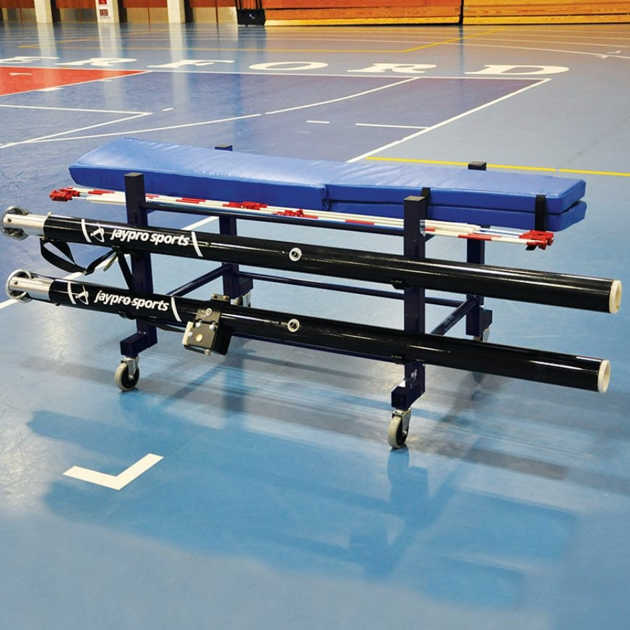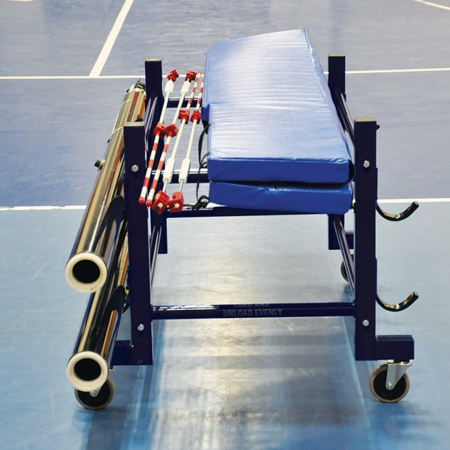 The Jaypro EC-500 Volleyball Equipment Carrier is a compact equipment carrier that features a heavy duty welded steel frame and can transport and store up to 4 uprights along with nets, pads and antennae.Â