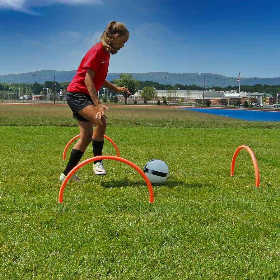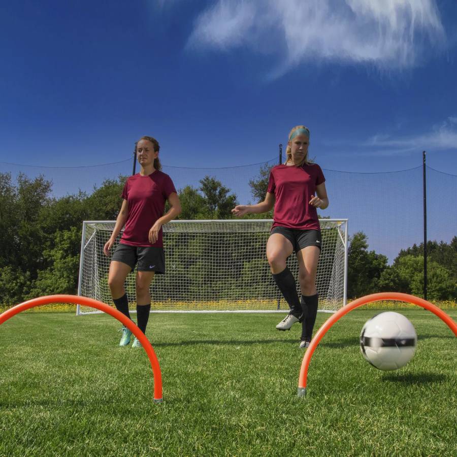 Expertly designed with durable 1" round, high-impact plastic, the Kwik Goal Hi-Vis Training Arches are versatile tools for small-sided soccer drills, passing drills, and conditioning drills. The bright orange color ensures high visibility on natural surfaces. Set of 4 arches measuring 14 ½" x 25".