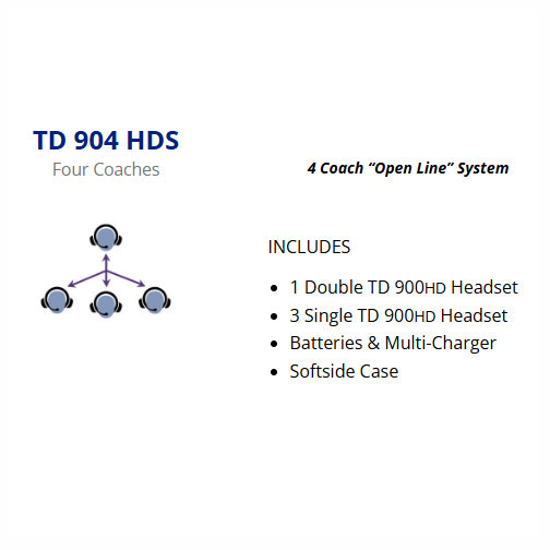 Your complete Single Channel system comes with everything you need right out of the box including TD 900HD wireless headsets, Case, Batteries and Multi-Charger. To Start up your set just install the batteries, turn the headsets “ON” and talk, it’s that simple.