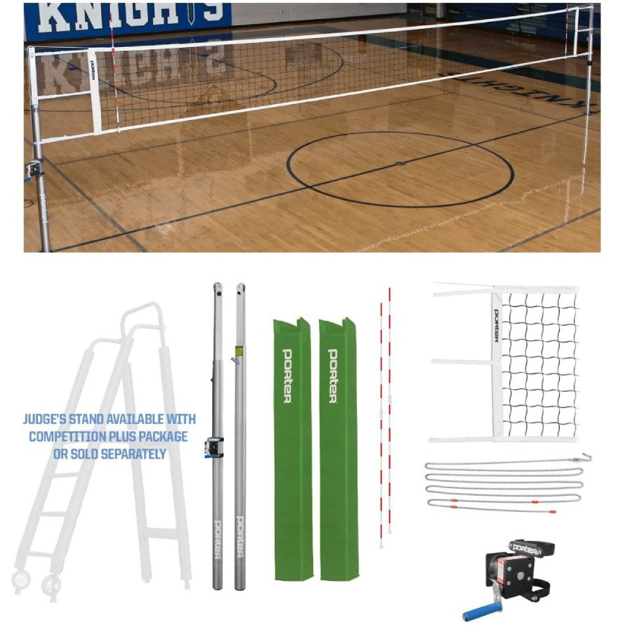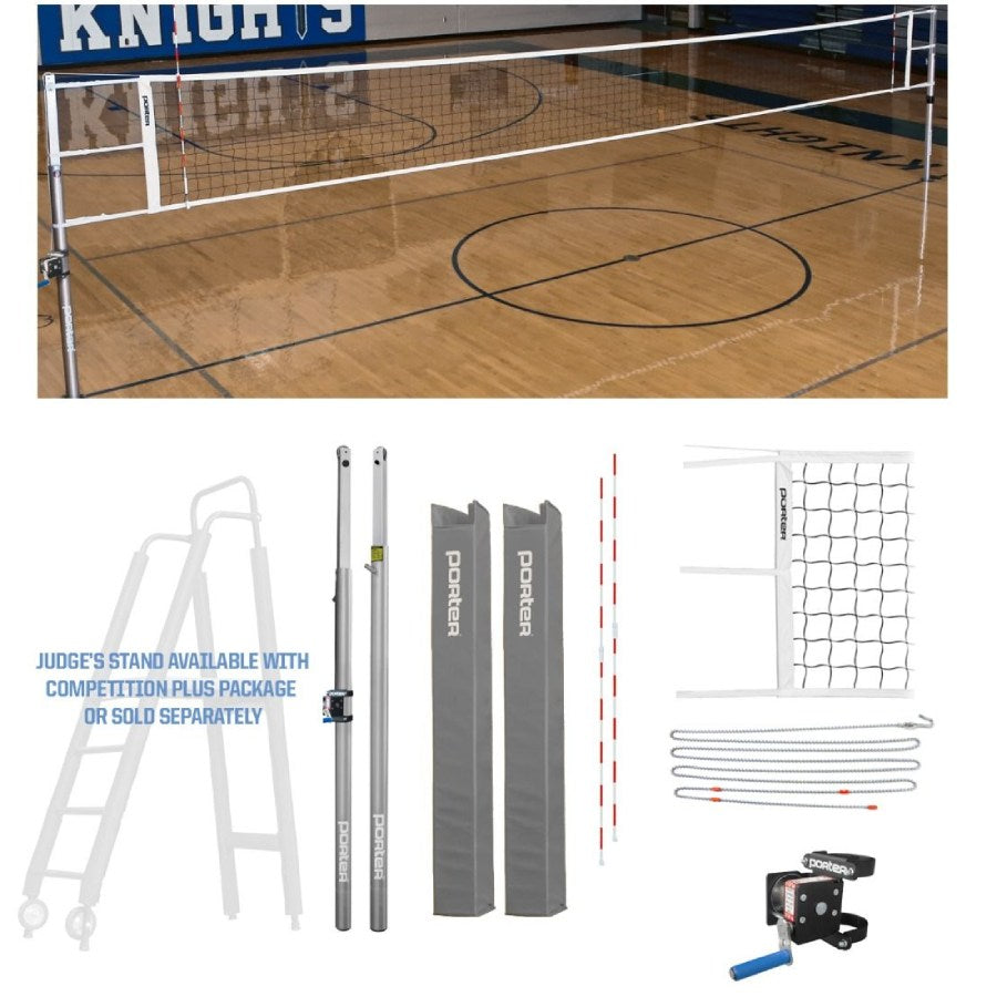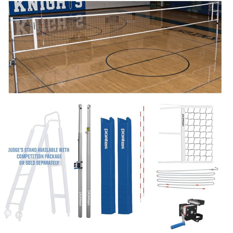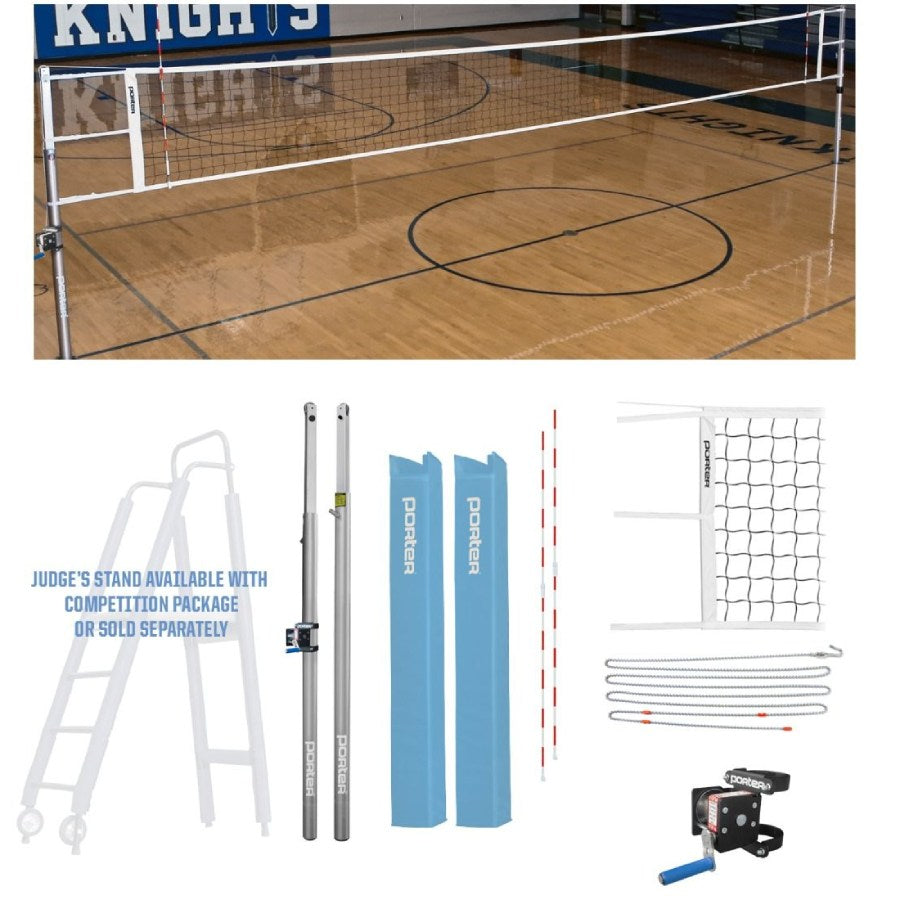 The Porter Powr-line standards are engineered and manufactured to meet the exacting demands of championship play with maximum safety. Constructed of high strength, lightweight aluminum, the standards offer quick set up and easy storage. Net heights adjust from Olympic competition to elementary height settings as specified by the FIVB, NFHS and the USAV. Each system features a manufacturer's 10 year limited warranty.