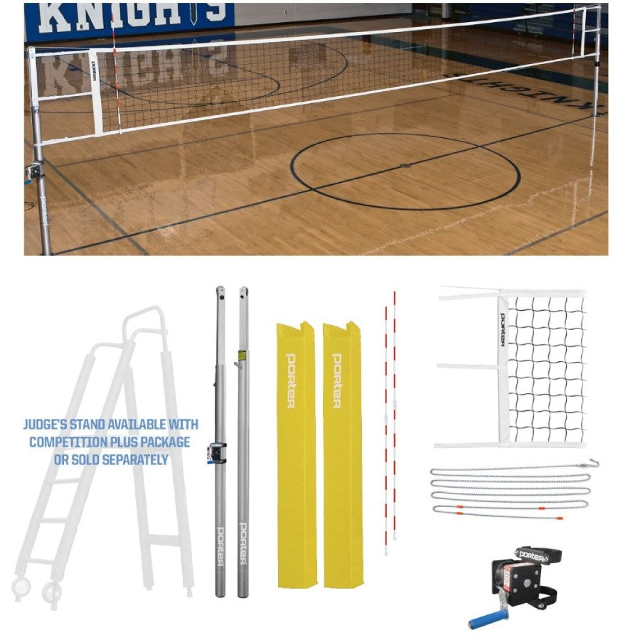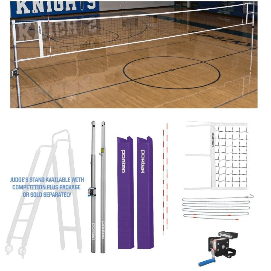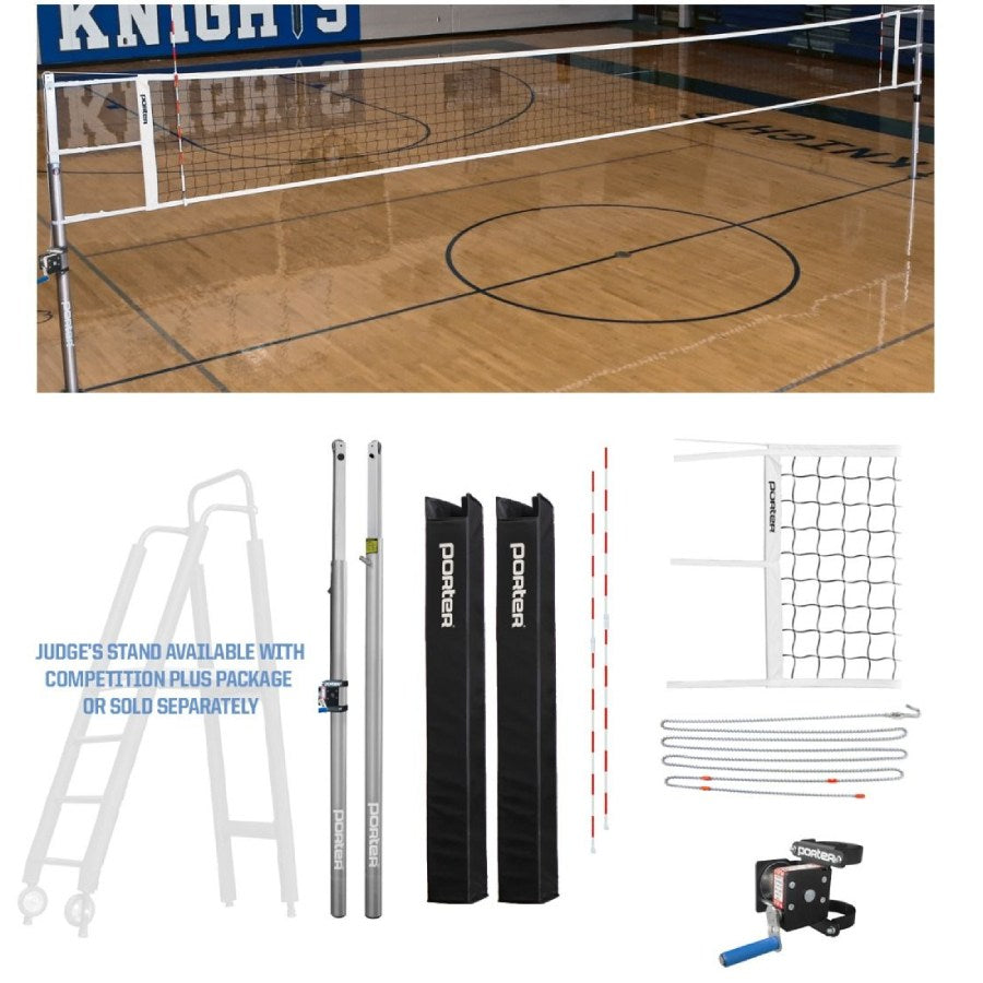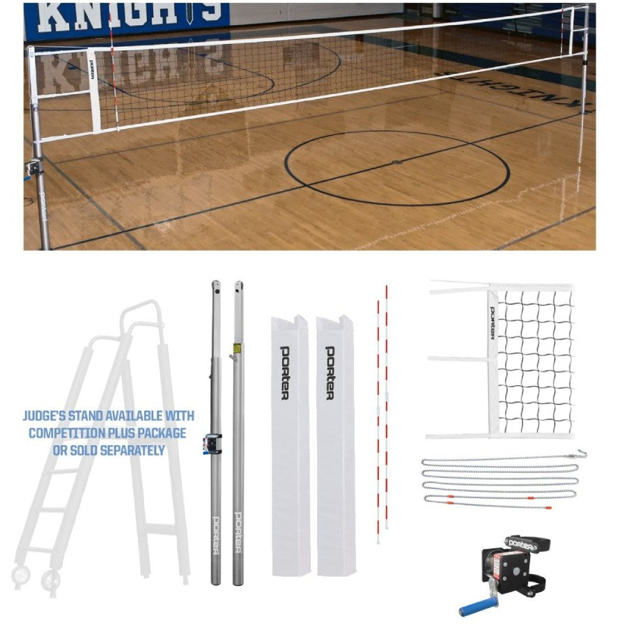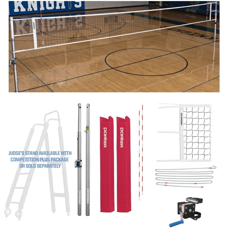 The Porter Powr-line standards are engineered and manufactured to meet the exacting demands of championship play with maximum safety. Constructed of high strength, lightweight aluminum, the standards offer quick set up and easy storage. Net heights adjust from Olympic competition to elementary height settings as specified by the FIVB, NFHS and the USAV. Each system features a manufacturer's 10 year limited warranty.