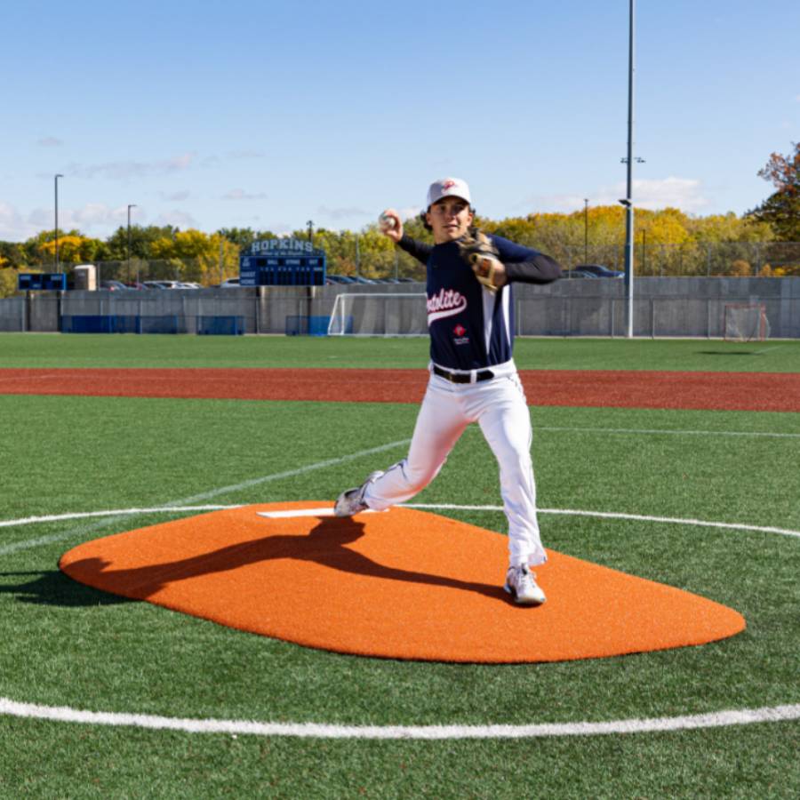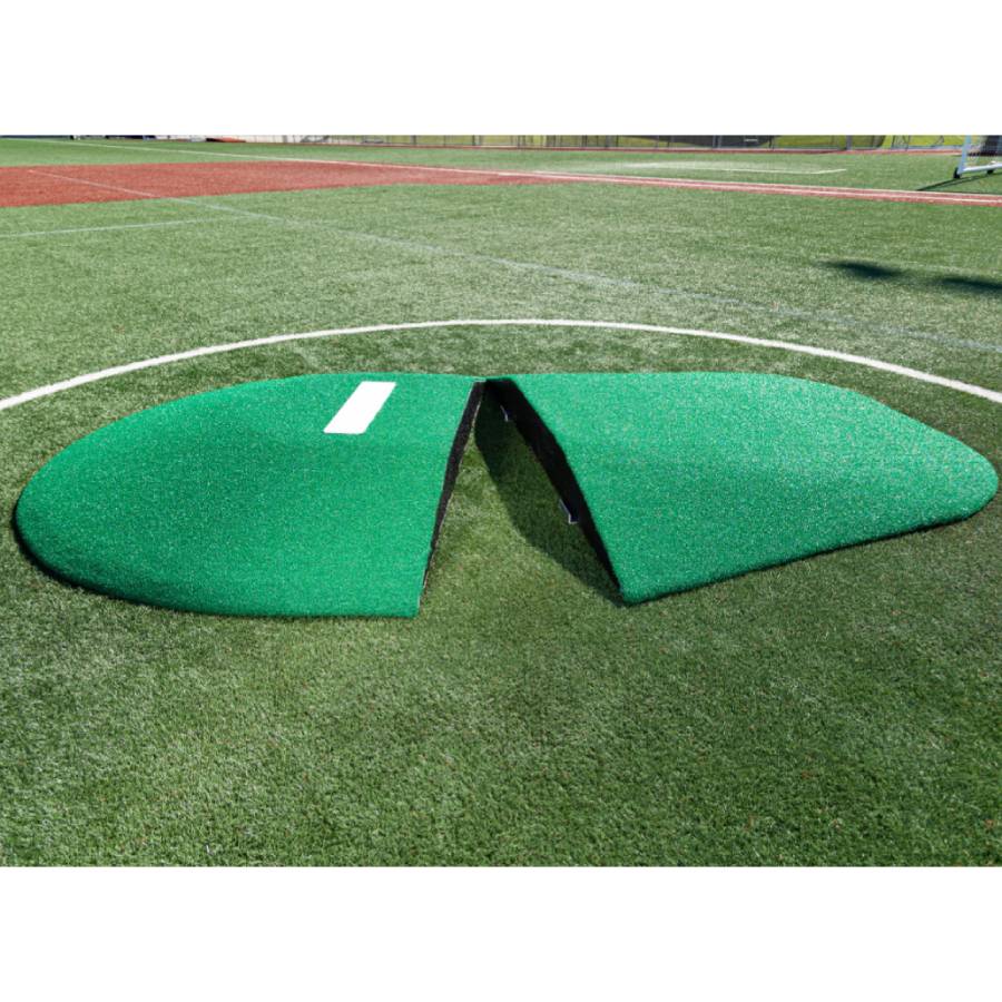 The Portolite TMP9550 two-piece game pitching mound is great for any high school game. The two-piece design helps make the mound easier to store and transport, only requiring two people per half to easily move it from place to place. Despite it's two-piece design, it still gives the pitcher the feel of a regulation baseball mound. The high performance poly protected resilient core with fiberglass reinforcement helps to give the pitcher a solid, no bounce, yet cushioned baseball mound that reduces knee and ankle strain.