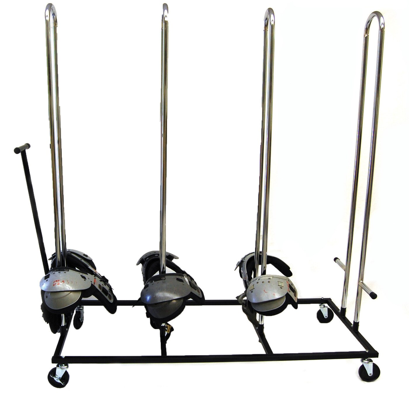 We've search high and low for the bets football shoulder pad rack for our customers. Something sturdy and long lasting but priced right. This pro model football shoulder pad rack is perfect. It can hold up to 60 XXL shoulder pads, features a heavy duty steel bottom frame, a retractable pull handle and large locking wheels. It rolls easily on and off the field as well as in the locker room. Steel uprights with bottom position bars allow for neat and orderly stacking.