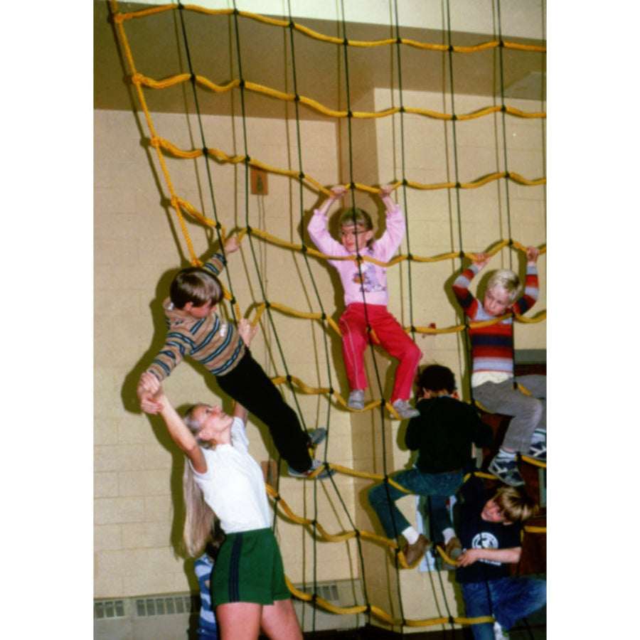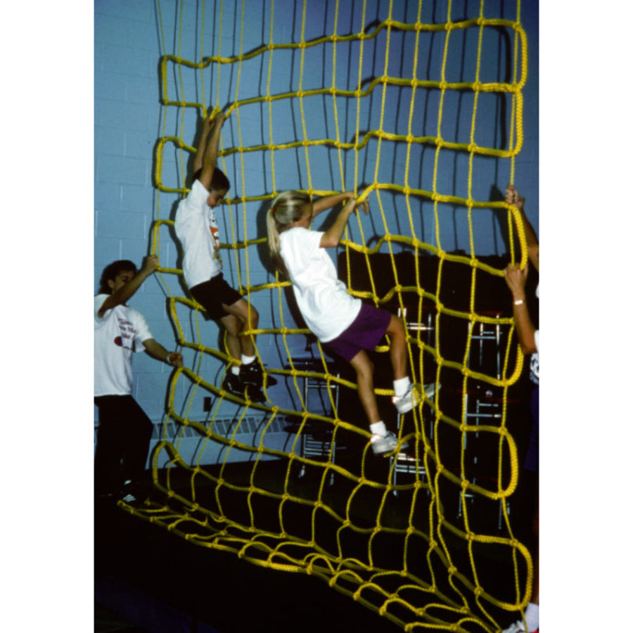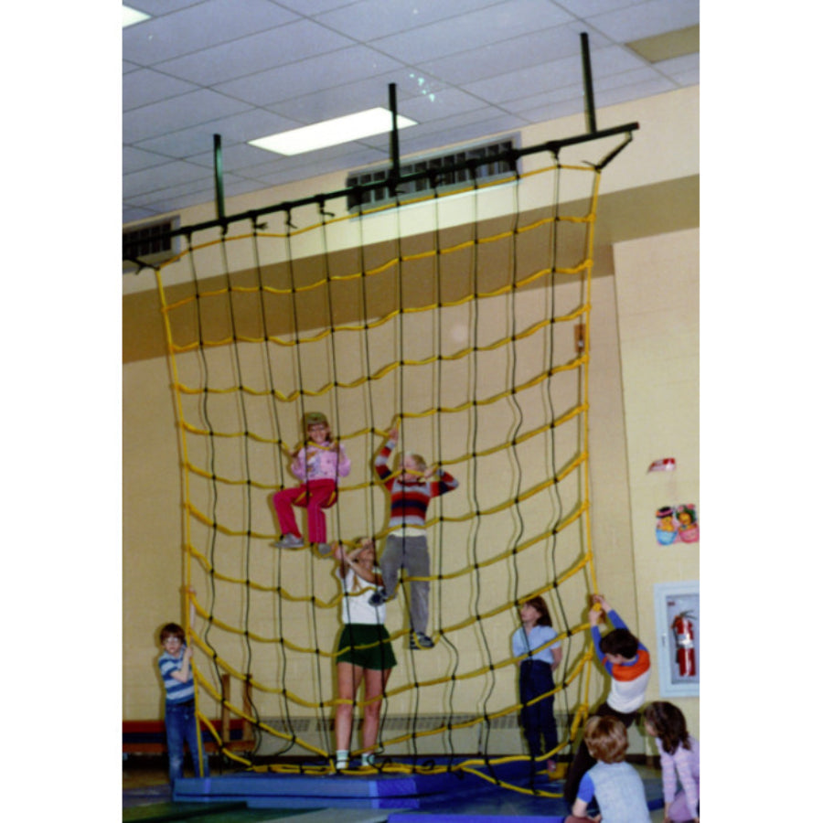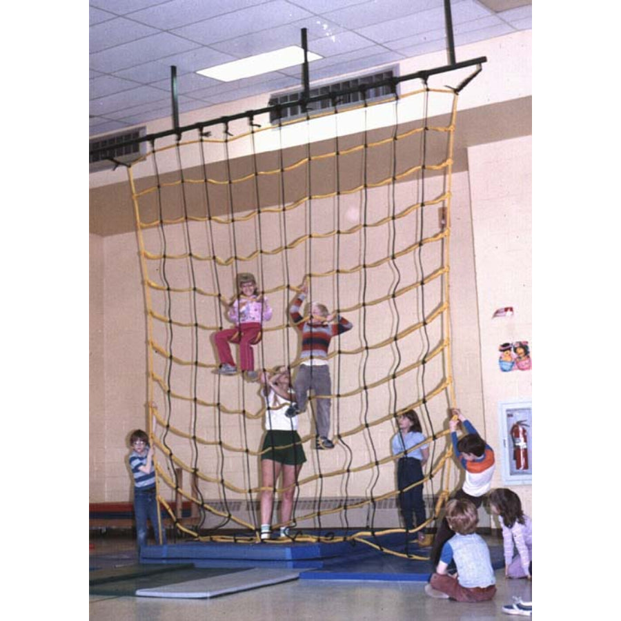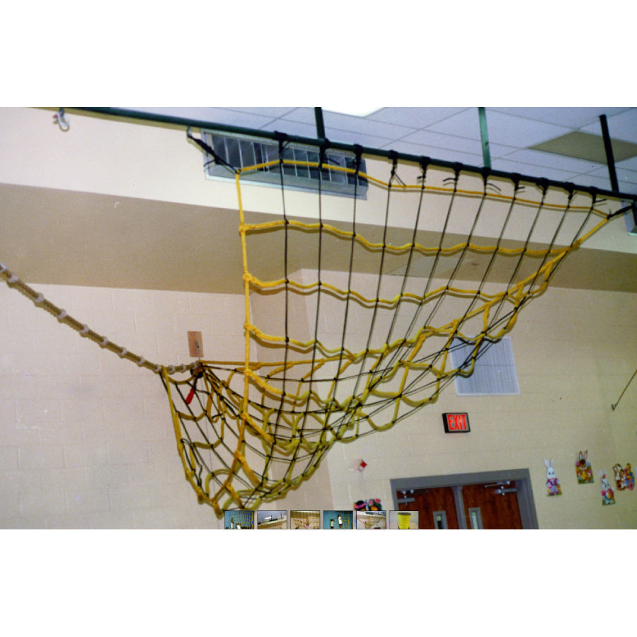 Climbing cargo nets are hand crafted using quality 3/4" poly rope with 1/2" poly rope vertical lanyards utilizing a "no slip" hitch design with tie offs on top. Climbing cargo nets have a 12" square mesh grid allowing numerous climbing movements. The top of each net has approximately 4' of lanyard for tying net onto smooth surfaced ceiling hardware. Nets are lightweight and easily raising to the ceiling using the net hoist below. Detailed instructions on installation, care, and use of the cargo net is provided with each cargo net for your convenience. Mats, spotters, and supervision is required when using cargo nets.