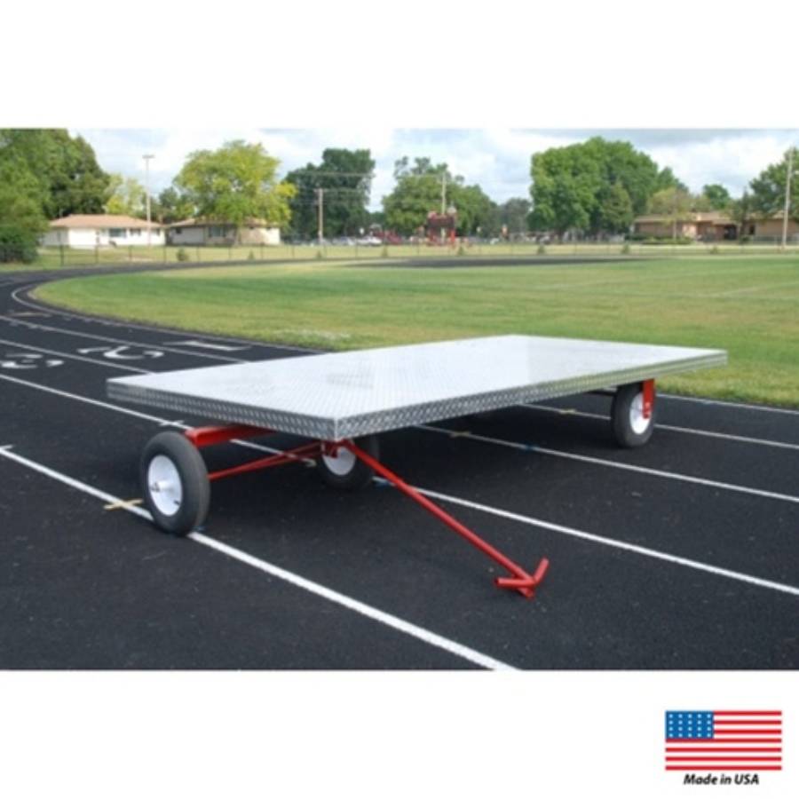 Super Cartsâ„¢ Aluminum Flat-Bed Cart! Experience superior strength and durability with the Super Cart when transporting your equipment from storage to the track and vise versa. This super cart can transport all pits, hurdles, standards, and more! Industrial-grade front axle swivel provides ease in steering. Constructed of tread-plate, rust free aluminum surface and frame. 16" fully pneumatic tires for easy pulling on most surfaces. Can be pulled behind a small tractor. It has a 1000 lb. capacity.Â