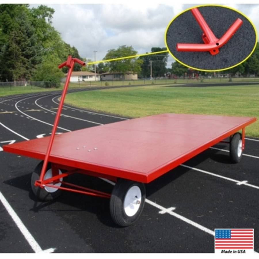 Super Carts™ Wood Flat-Bed Cart! Transporting your equipment between storage and your track has never been easier! This super wood flat-bed cart can transport all pits, hurdles, standards, and more! Industrial-grade front axle swivel provides ease in steering. Heavy-duty plywood load surface, recessed in steel frame for protection. 16" fully pneumatic tires for easy pulling on most surfaces. Can be pulled behind a small tractor. It has a 1000 lb. capacity.