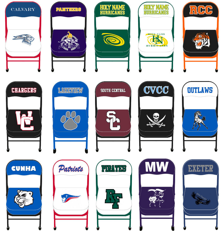 The Deluxe Custom Sideline Chairs give you the ability to add your logo. We have done many awesome designs over the years. Another benefit is that we do not require vector artwork. If you do not have vector, it's no problem. Just send us a jpeg of what you want and some ideas about the design and we will make it happen. You can see a small sample of some of the chairs we have done in the past in the picture above. You can print on the seat top and backrest which is included in the listed price. Also available is the additional option to print on the front or back edge of the chair. The front or back edge give you the ability to add a sponsors name or logo. If you have a PMS color that needs to be matched we can do that, just let us know the PMS color #'s when you place your order.
