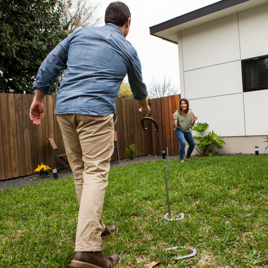 The Champion Sports Deluxe Horseshoe Tournament Set features everything you need to set up a horseshoe tournament, including a set of rules to ensure games stay on track. The tough steel horseshoes are plated with chrome and brass for an attractive shine and extra durability, and the set includes two rugged chrome-plated steel stakes to take aim at. The horseshoe set comes with a carrying bag made from strong 1680 denier nylon fabric that can endure toting the sturdy heavy metal pieces around with ease.