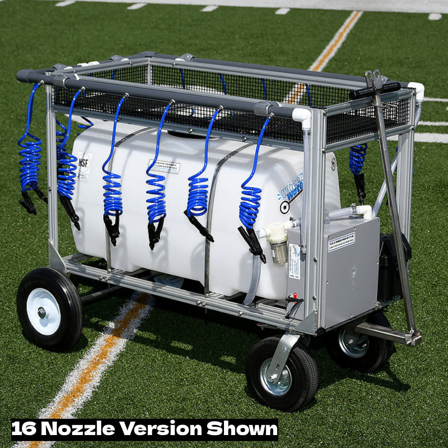 Are you looking for the ultimate hydration tool when space and handling are an issue, but you demand a large quantity of clean, fresh water and an abundance of drinking nozzles? Well look no further, the Wheelin' Water Team Manager Hydration System is perfect for your team. It comes standard with 10 nozzles that wrap around 3 sides of the cart that give you ample room between outlets for athletes. This hydration system will fit through a 33" door and has the turning ability of a play wagon in it's all stainless steel steering assembly. The low to the ground 50 gal. tank allows you to maneuver easier and use the top basket for all your training supplies, allowing athletes to get their own needed items and saving trainers time with running for supplies and extra water. This hydration system arrives to you assembled and ready to us.